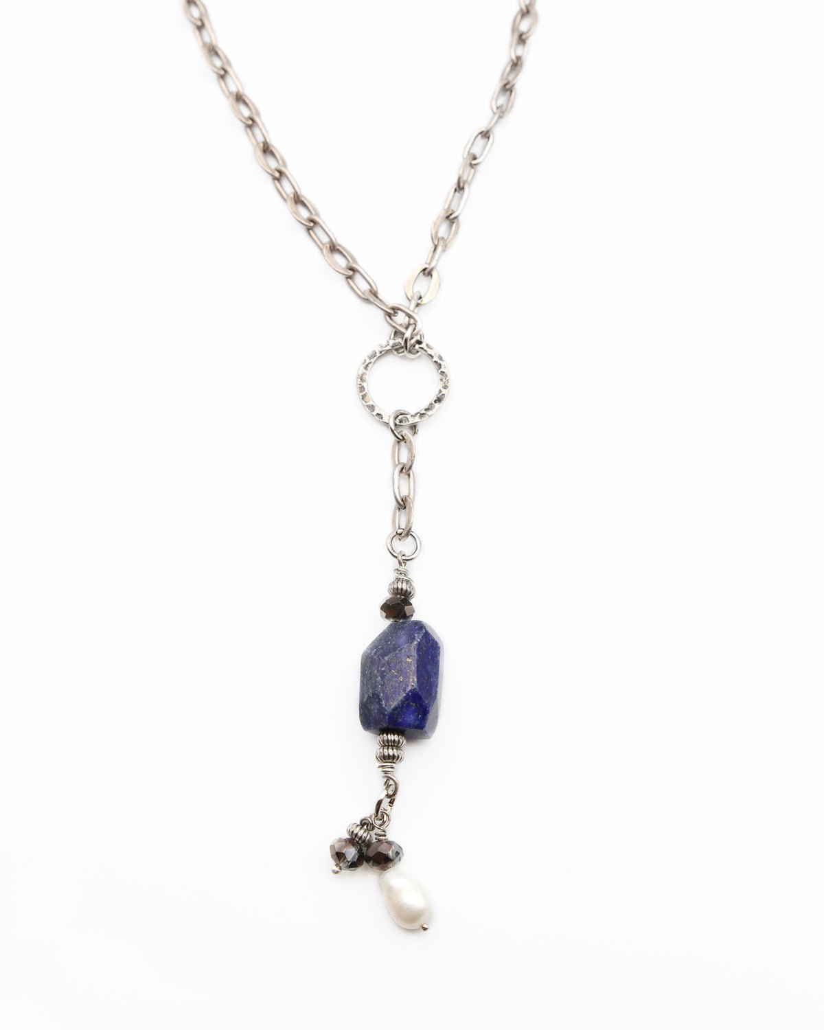 The Doreen Necklace is a headturner!? The large lapis lazuli stone pendant and freshwater pearl give this necklace tons of visual appeal!? The longer length of the chunky?antique silver chain makes it perfect for your tank and cardigan combo.? You’ll find yourself reaching for this one again and again this fall and winter!